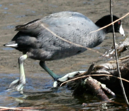 Turns out our visitor wasn’t an odd duck or any other kind, either. He was an American Coot, a member of the rail family. And their feet are big and fat like Big Bird’s. Because it’s too hard for experts to keep saying “big fat feet like mukluks,” they describe these lobed feet as fissipalmate.